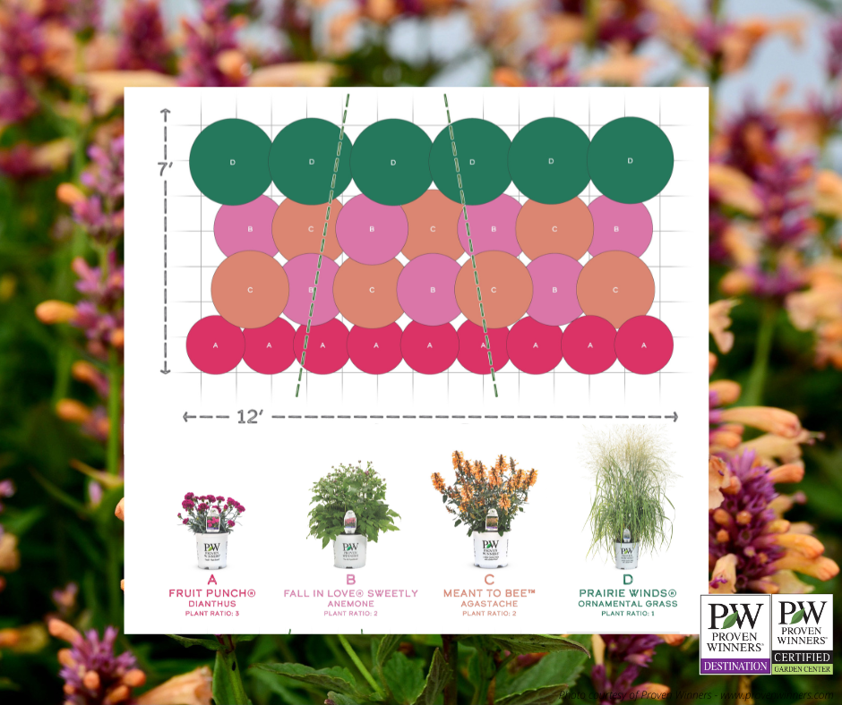 Your garden will THRIVE thru the GEORGIA HEAT with this combination of colorful perennials. The evergreen foliage of FRUIT PUNCH® Dianthus will keep year long interest along the front of the bed. Flowers that appear across the top of the habit in Spring are icing on the cake. In Summer MEANT TO BEE™ Agastache will burst into bloom with large, floriferous habits. FALL IN LOVE® ‘Sweetly’ Anemone will add bright pink flowers in Fall, appearing for many weeks. PRAIRIE WINDS® Ornamental Grasses add fine texture throughout the entire growing season and provide Winter interest.